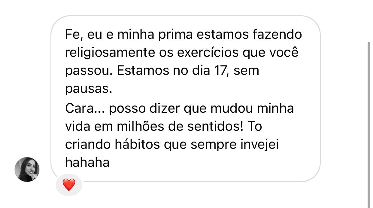 Com total certeza! Você será acompanhado por mim durante todo o período do curso, tirando dúvidas via WhatsApp e na comunidade exclusiva para alunos no Facebook. Já são mais de 100 aulas disponíveis na plataforma, com fichas e diário de treino, fazendo você botar em prática o Método FAIR (frequência, alimentação, intensidade e repouso). Mais de 2.000 alunos aprovaram e tiveram resultados treinando comigo. Você também terá!
